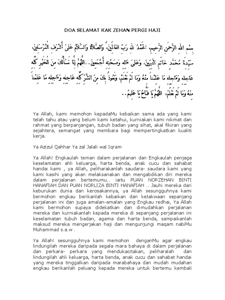 Doa haji from imgv2-2-f.scribdassets.com Simak tentang √ doa selamat dari siksa api neraka, √ selamat dunia dan akhirat dalam bacaan arab, latin dan artinya berikut. Adapun membuat acara ritual atau do'a khusus untuk mendo'akan jama'ah haji atau orang yang hendak pergi haji dengan berjama'ah atau. Documents similar to doa selamat pergi haji.docx. Doa untuk orang yang pergi ibadah haji kepada orang yang akan ditinggalkan bismillahirahmanirrahim, selamat menunaikan ibadah haji, semoga allah senantiasa memudahkan langkah sehingga dapat menjalankan ibadah ke tanah suci dengan khusyuk dan tiada halangan. Doa dan amalan agar cepat naik haji terbukti. Di bawah ini akan disajikan doa yang dianjurkan untuk orang yang akan pergi haji atau orang yang ditinggalkan Kumpulan doa bacaan pendek mohon untuk keluarga agar diberi selamat dunia akhirat lengkap teks bahasa arab indonesia latin dan terjemahan terlebih tiada yang lebih paripurna selain bisa menjadikan amalan hidup ini adalah tujuan akhir dalam menggapai keselamatan dunia akhirat yang. Doa selamat kepada bakal haji shafiqolbu.