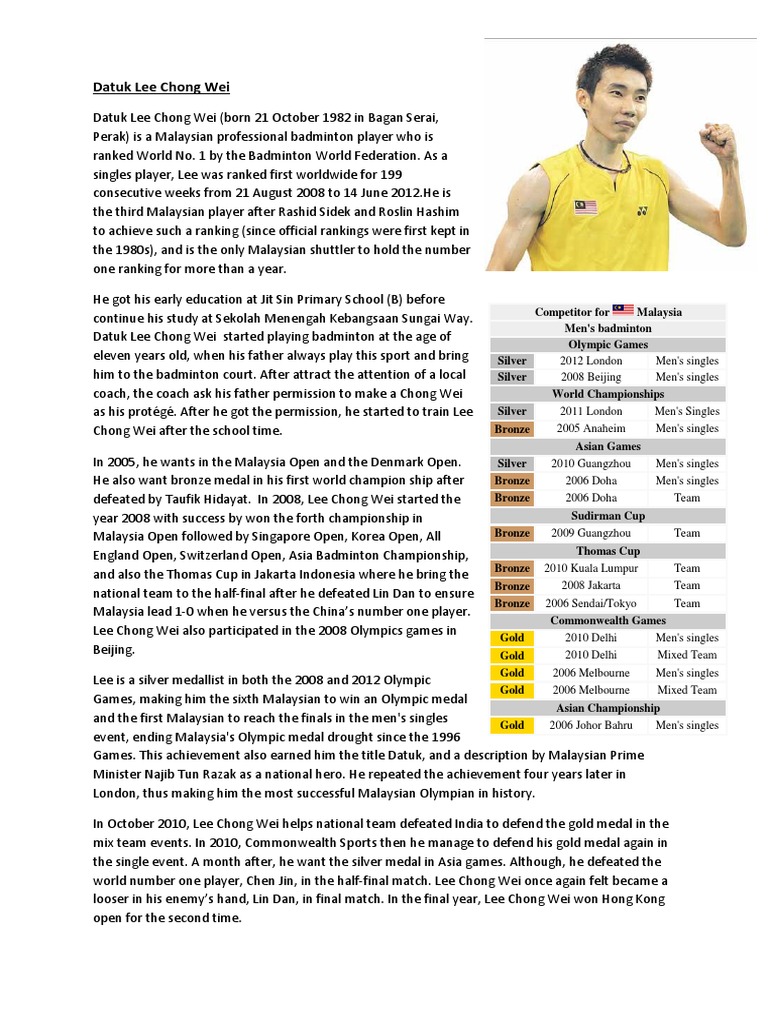 Doc Biodata Datuk Lee Chong Wei Zaimah Anuar Academia Edu from 0.academia-photos.com 1 international badminton player datuk wira lee chong wei from malaysia. Bagan serai, perak kerjaya : Pemain badminton perseorangan negara pendidikan : 34 tahun (berdasarkan tarikh kemaskini) alamat rumah. 34 tahun (2016) asal : Datuk lee chong wei (simplified chinese: In his early years, lee favoured basketball, however his mother soon forbade him from the game due to the searing heat of the outdoor basketball court. He won the silver medal in the 2008 olympic games.